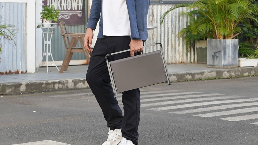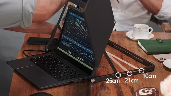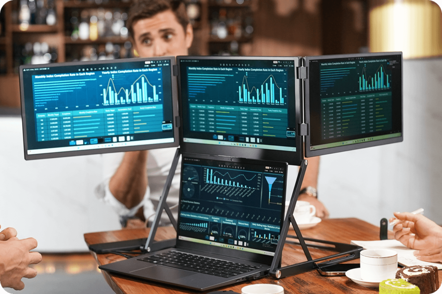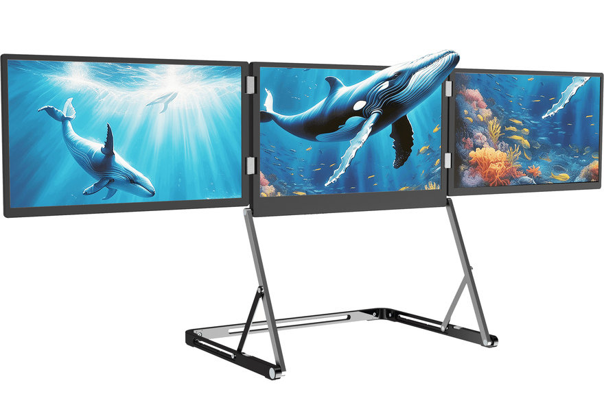 More Crazy Multiscreen This product consists of three 15.6-inch 4K screens, a built-in battery, and a built-in stand. It folds up to the size of a briefcase for easy transport and weighs 3 kg (6.6 lbs). It's compatible with Macs and PCs.