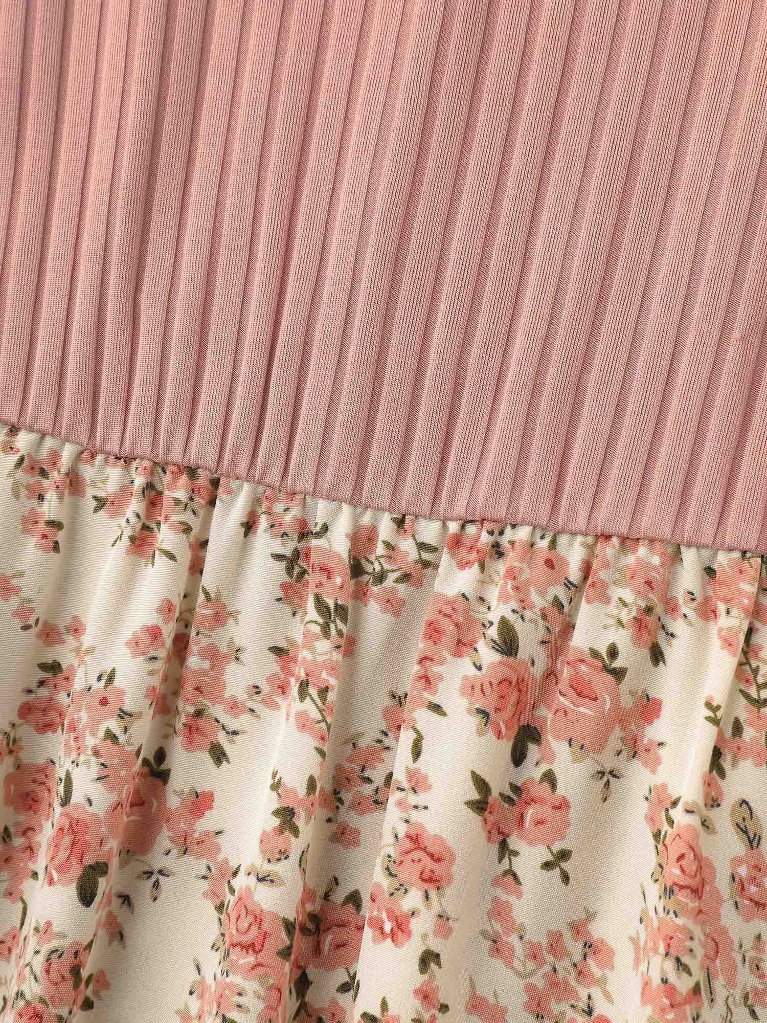 Floral Color Contrast Ribbed Pockets Maxi Dress