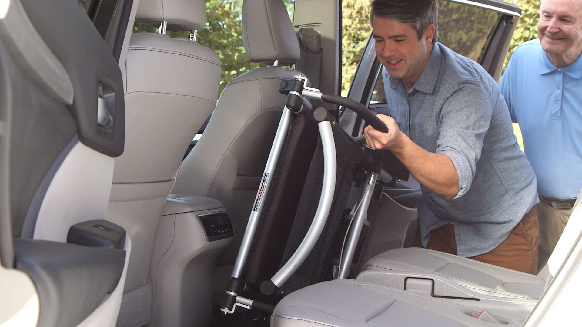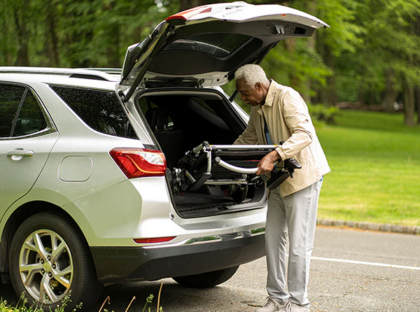 We is light enough for you or a helper to put it in your back seat or trunk. No ramps or lifts are needed! When it's folded, it even rolls like a suitcase.