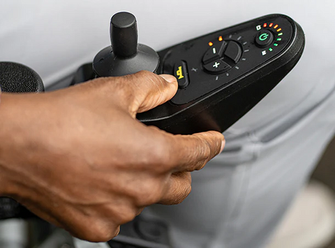 Operate your chair with one hand. Move the joystick in the direction you want to go. The joystick moves you forward, backward, and to either side. Go at your own speed with five-speed settings ranging from 0 to 3.7 mph.