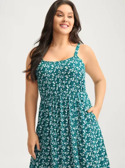 Rayon Ditsy Floral Print Pockets Midi Dress