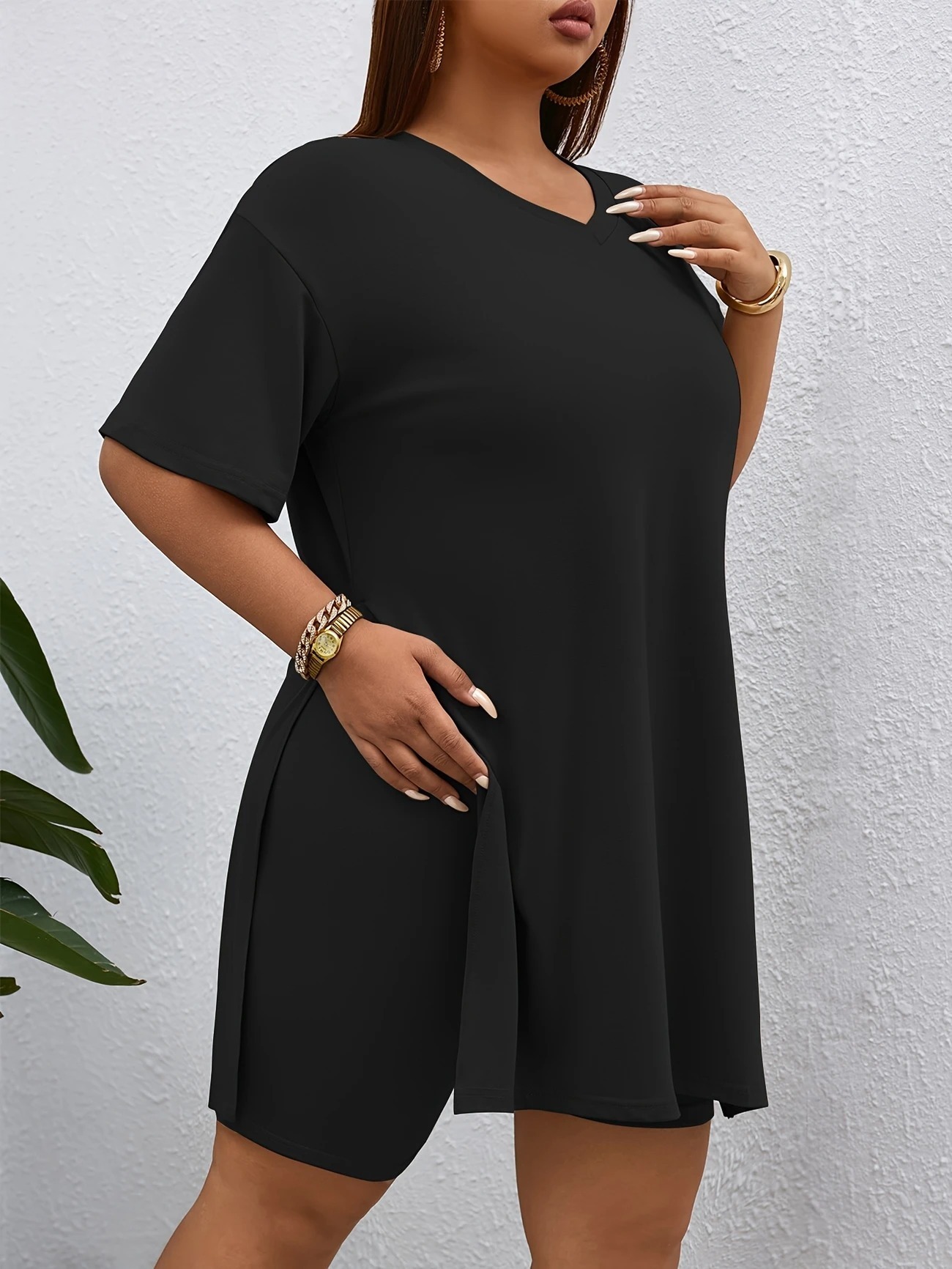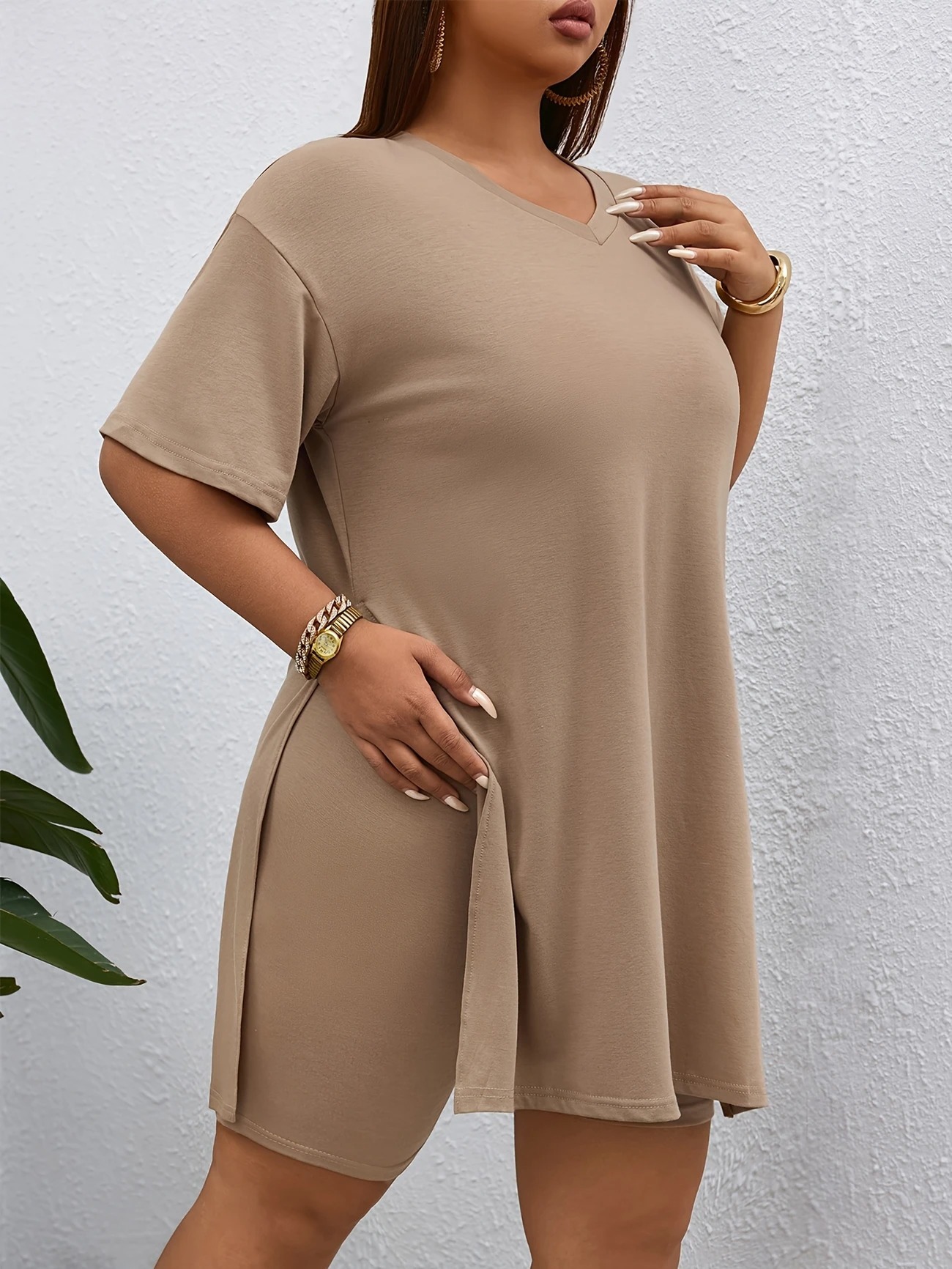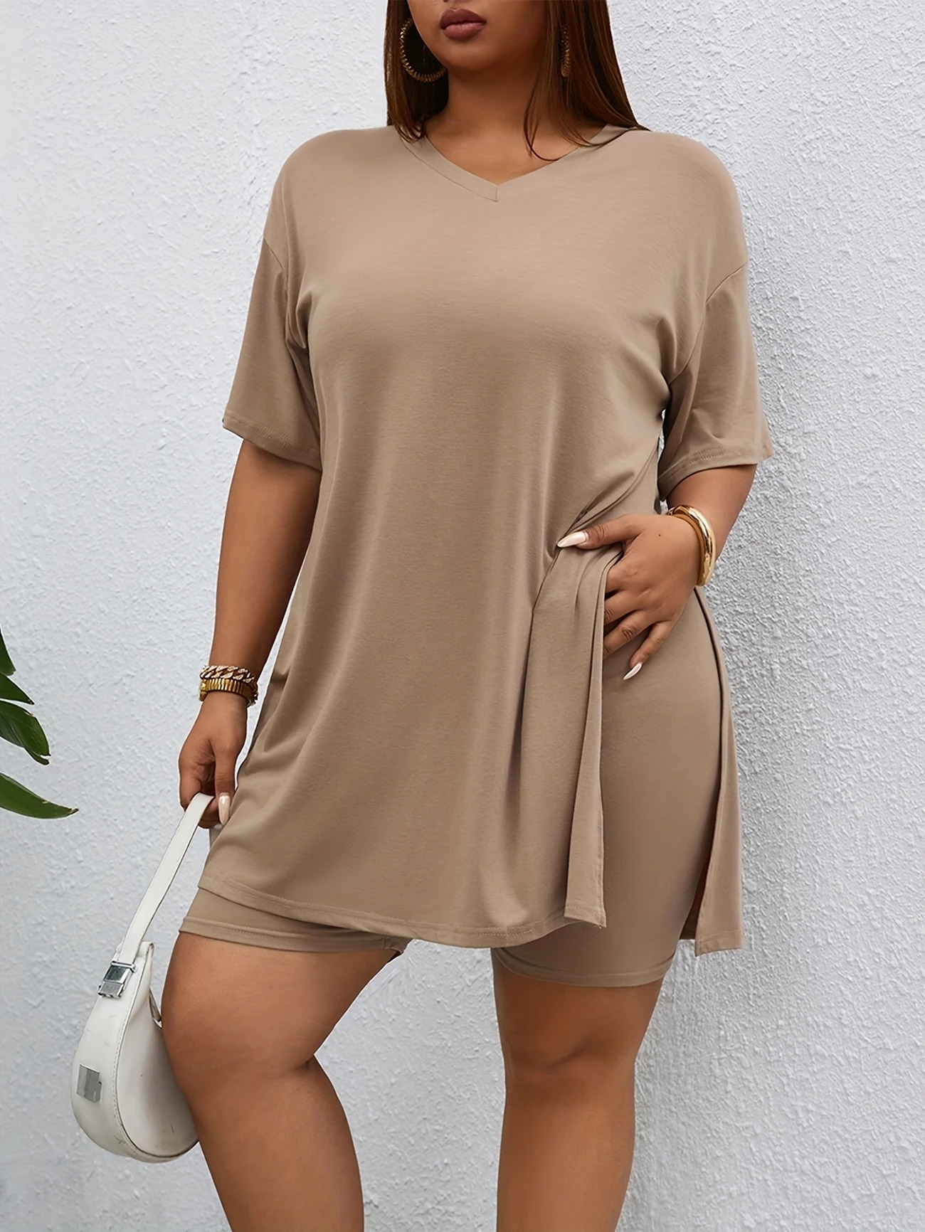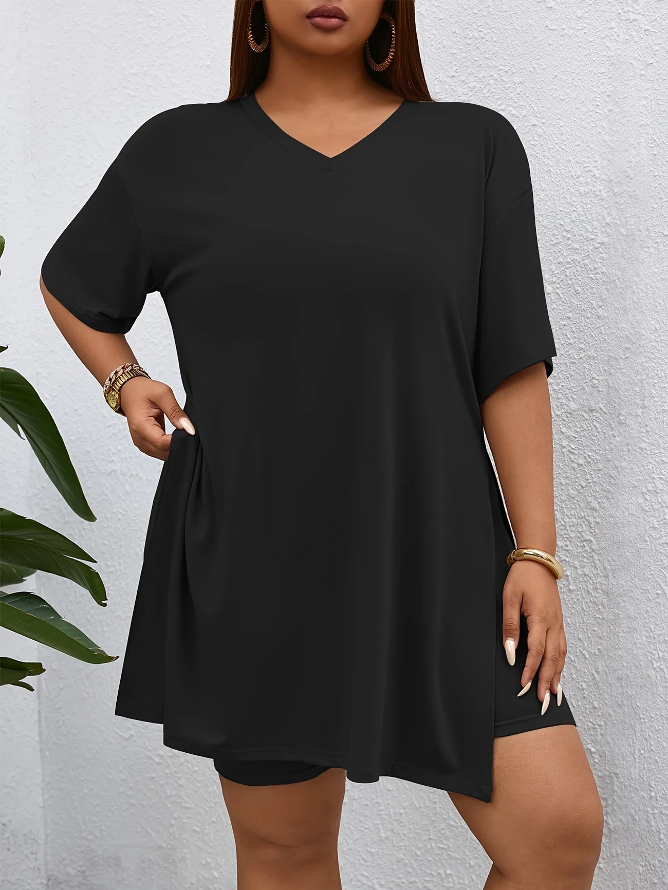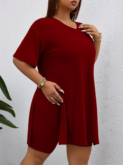 Top: A relaxed-fit, V-neck short-sleeve top with a longer length, high side slit, and soft stretchy fabric that drapes effortlessly over the shorts.
