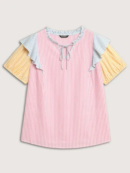 Cotton Colorful Stripes Ruffled Neck Tie Blouse