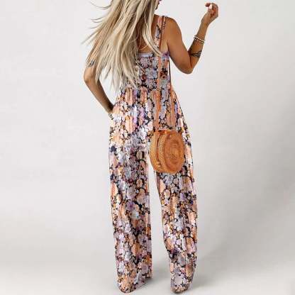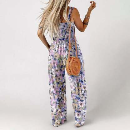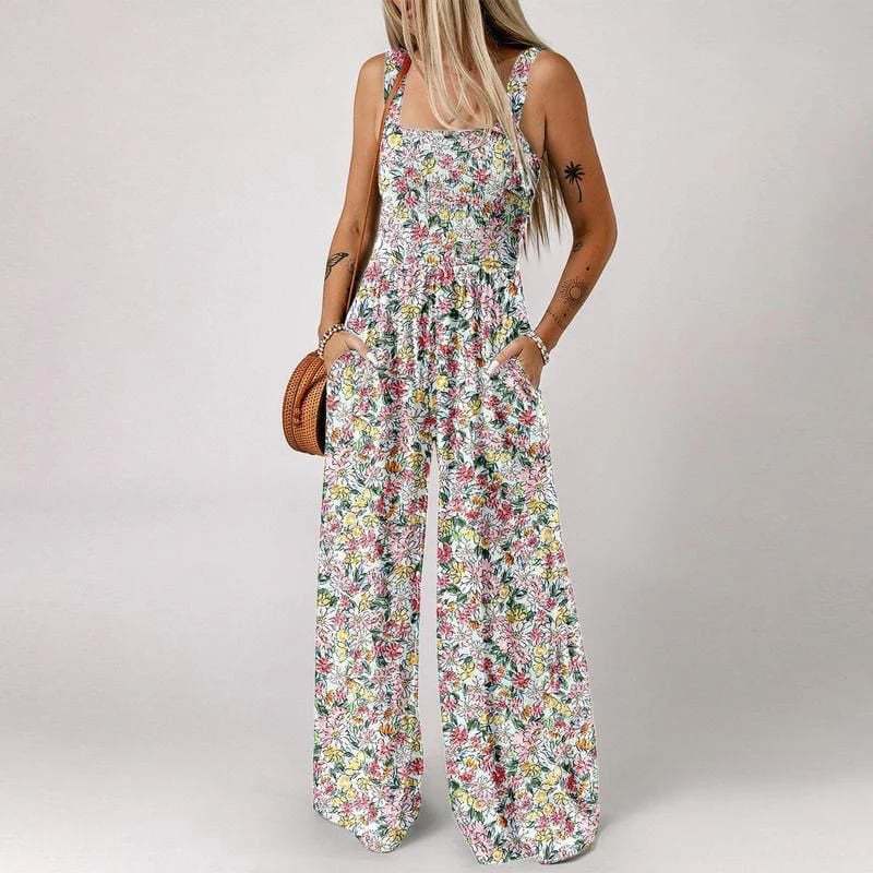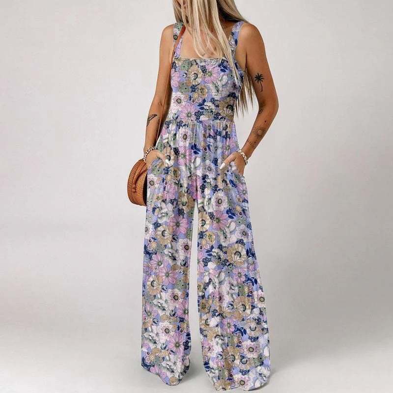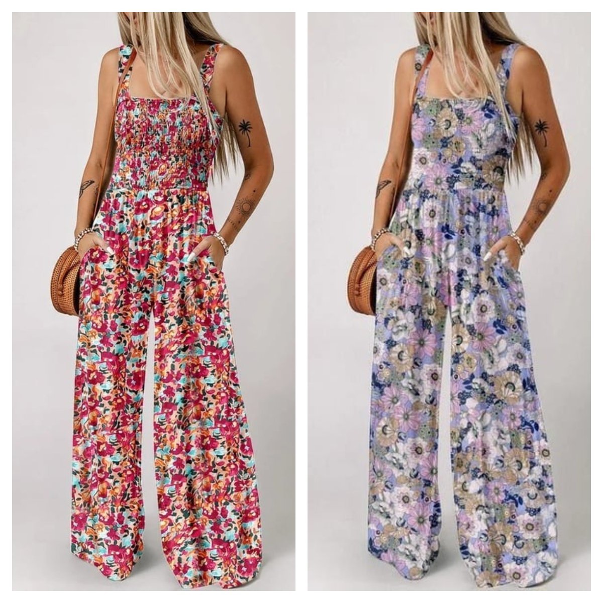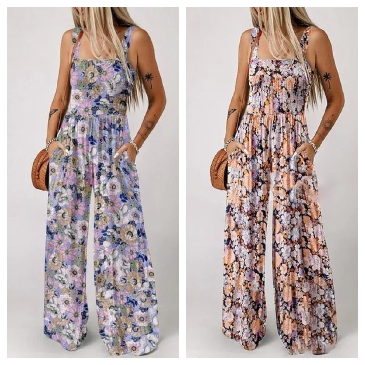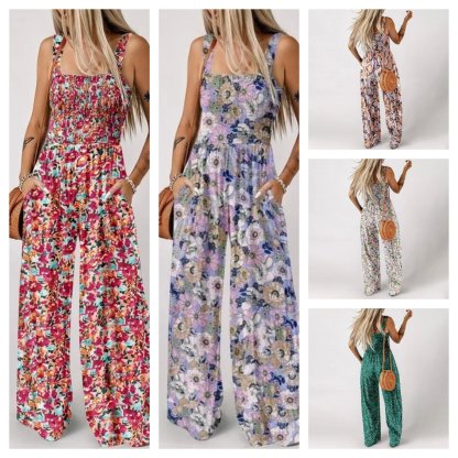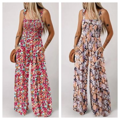 Womens jumpsuit design with sleeveless, square neck, floral print, high waist, smocked bust,wide leg long pants, two pockets, one piece jumpsuits, summer outfits for women.