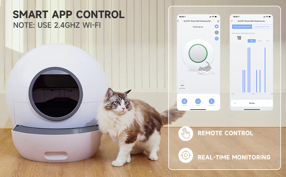 APP REMOTE CONTROL & CLEANING SYSTEM: Cat litter box self-cleaning can operate via APP(2.4Ghz Wi-Fi Only),Can set the number of minutes after the cat goes to the toilet to automatically clean up so that it will be clean and refreshed every time.It will record each cat's toilet habits.