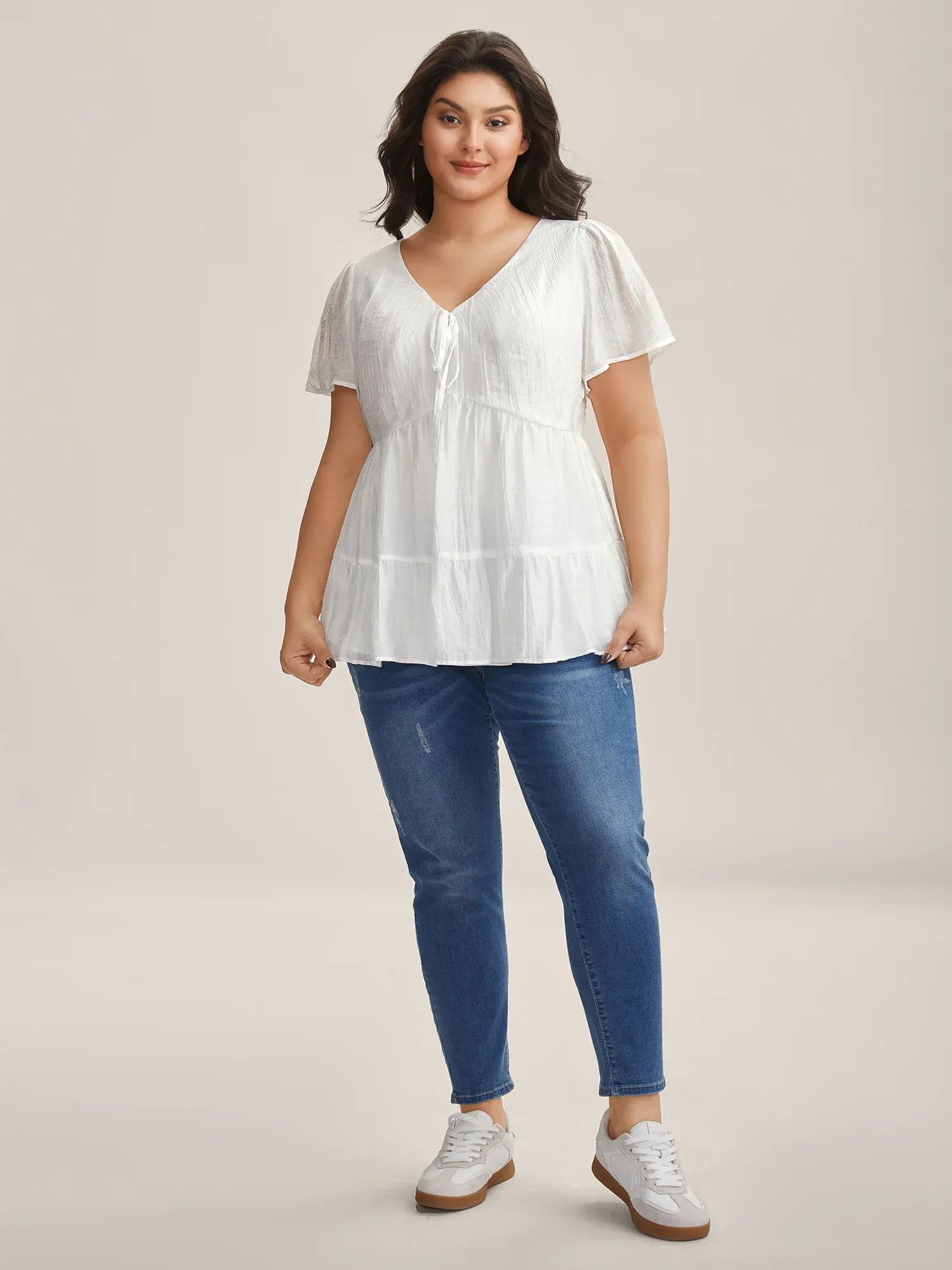Sheer V-Neck Tie Tiered Blouse