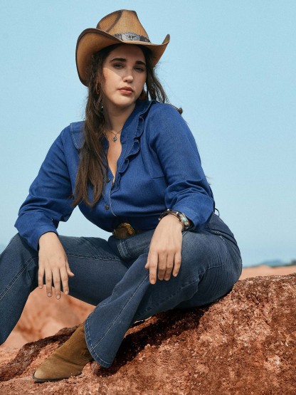 Stretch Denim Lotus Leaf Neckline Shirt