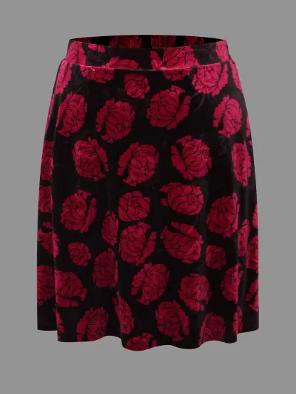 Velvet Floral Elastic Waist Skirt