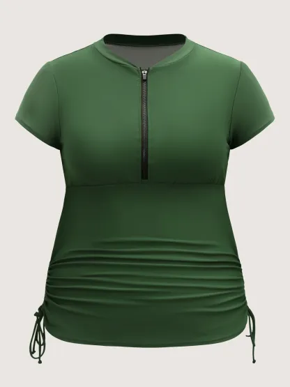 Zipper Drawstring Detail Solid Swim Top
